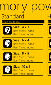 Memory Power is one of the challenging memory games for Windows Phone. This game helps you improve your memory and features more than 100 patterns. You will try to find out the blocks with same pattern and turn all block up. It is available for free download.
